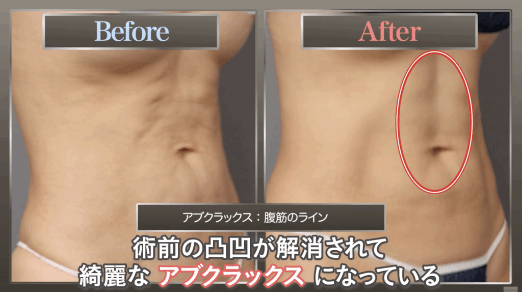 そこで今回私が行ったのは、リゴトミー(デコボコの原因である「皮膚の癒着」を、針を使って剥がす技術)と脂肪注入です。その結果、術後半年で表面のデコボコ感が消えて、きれいなアブクラックス(腹筋のライン)になっています。
