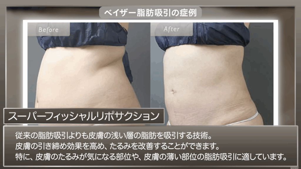 このような場合、私たちは皮膚の収縮が最も得意な「ベイザー」という機械を使います。さらに「スーパーフィッシャルリポサクション」といって、皮膚の浅い層を吸引し、皮膚の引き締め効果を高める技術も使っています。