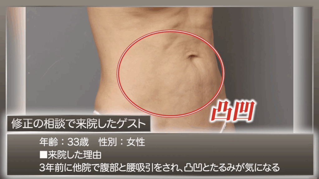 海外でお腹の脂肪吸引を受けて3年経った状態でした。写真からわかりますように、皮膚が凸凹で、たるみも目立っています。この状態で既に3年経っていますので、もう自然には治りません。