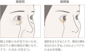 経結膜脱脂法+脂肪注入の組み合わせを行います。目の下の脂肪を取り除いてから、たるみ部分に脂肪を注入することで凸凹をなくし、よりフラットで健康的な仕上がりになります。
