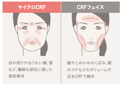 マイクロCRFは滑らかで伸びのよい繊細な脂肪細胞で構成されているため、目の下のクマや小じわなどのデリケートな部位にもなじみやすく、自然な仕上がりが期待できます。