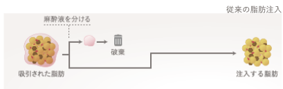 従来の脂肪注入では、壊れてしまった細胞や老化した細胞などの不純物が含まれ、脂肪壊死やしこりになるリスクがありました。