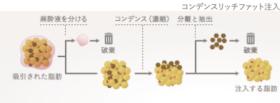 この「コンデンス(濃縮)技術」によって、健全な脂肪細胞のみを注入できるため、リスクを抑えながら、より多くの脂肪を定着させることが期待できます。