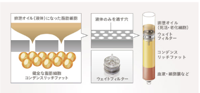 当院で使用するCRFは、採取した脂肪を外気に触れない状態で処理し、良質な脂肪細胞だけを濃縮・抽出しています。特許技術のフィルター(ウェイトフィルター)と遠心分離を組み合わせることで、しこりや脂肪壊死の原因となる死活細胞や老化細胞などの不純物を取り除くことができます。