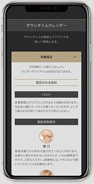 - 受けられた施術の経過日数ごとに、想定されるダウンタイムの症状や、症状を和らげるためのポイント、術後の日常生活での注意点(圧迫固定、入浴、食事、運動などについて)をご紹介します。