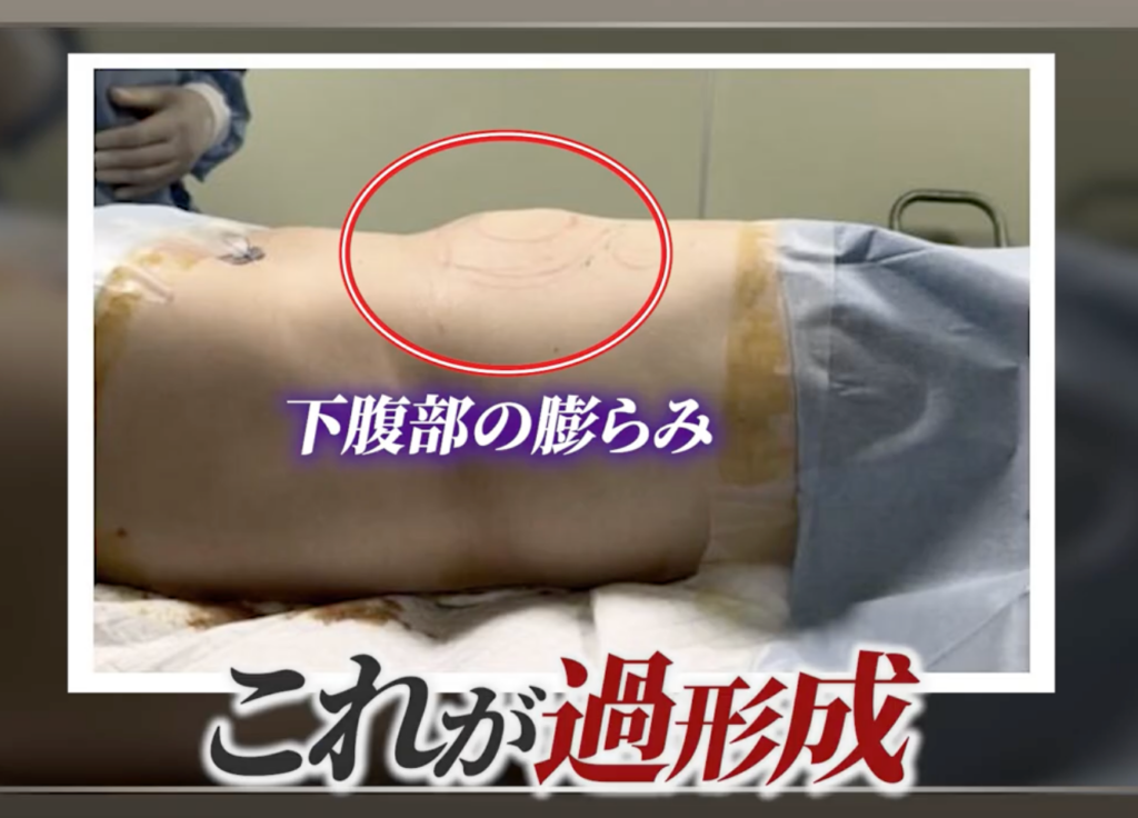 過去に他院で脂肪冷却して脂肪が増えてしまい、当院へ脂肪吸引のご相談に来られた方がいらっしゃいました。下の写真のように下腹部だけポコッと膨らんでいる、これが過形成です。脂肪冷却を当てた部分だけ脂肪が増えています。