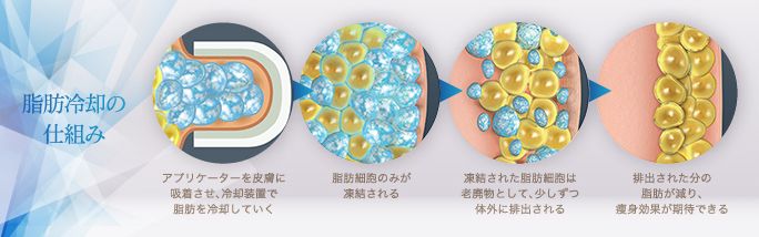 一方、脂肪冷却は簡単に言うと脂肪を凍らせる施術です。凍らせることで細胞がゆっくりと死に、体に吸収されることで脂肪が減ります。
