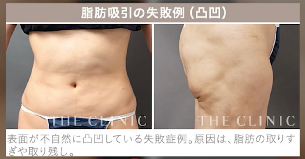脂肪を取ることで「皮膚のたるみ」というリスクが伴うことです。脂肪を取りすぎるとたるみが起きるため、注意が必要です。実際に脂肪の取りすぎや取り残しによる失敗も起きています。取り残しは皮膚の凸凹につながりますし、取りすぎて脂肪を0にしてしまうと皮膚が壊れ、柔らかさが失われてしまいます。
