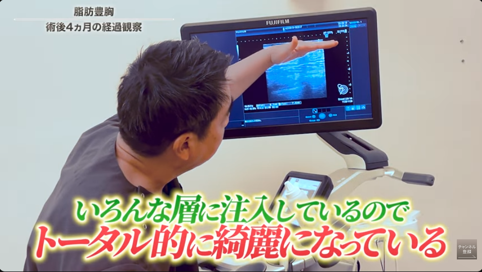 脂肪が定着しているか、しこりができていないかは、エコーで視覚的にチェックします。乳腺を確認すると、乳腺の上に脂肪が生き残っていることが分かります。皮下層は術前約2mmと薄い状態でしたが、術後は8mmと約4倍近い厚みになっています。さらに、今回の脂肪注入豊胸では皮下層だけでなく筋肉層にも注入を行っています。筋肉層は術前約5mmから9.2mmへと、倍近い厚みに変化しています。このようにさまざまな層に注入しているため、トータルで自然にきれいな状態となっています。しこりの有無も改めて確認しましたが、触診でもエコーでも認められませんでした。