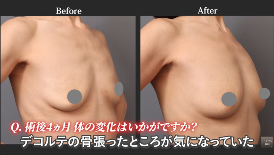 デコルテの骨ばった印象が気にならなくなり、鏡を見るたびに落ち込んでいた気持ちがなくなったことが一番大きいと仰っていました。施術直後よりは少し落ち着いたものの、施術前と比べると明らかにボリューム感の違いを感じられているようで、術後3ヶ月後には下着をつけた際にその変化を実感できたとのことです。