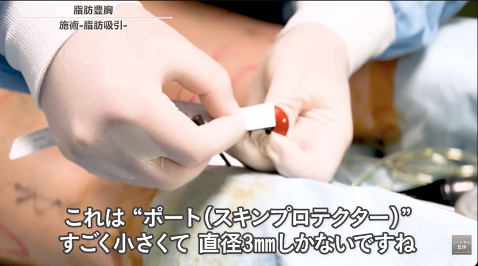 脂肪吸引の傷は、お尻下と膝裏のシワの中といった目立ちにくい位置に3mm程度と、最小限にとどめています。また、カニューレ(吸引管)操作の摩擦から皮膚を保護するスキンポートも必ず装着します。もちろん、術後も傷の大きさは変わっていません。