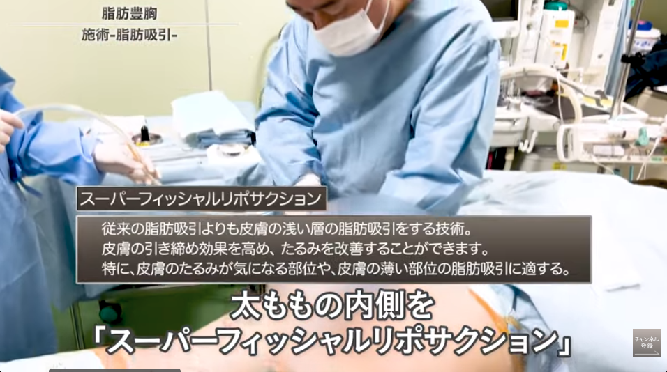 痩せ型のゲストだったので、脂肪の採取部位の選択肢は少なく、太もも全周からできるだけ集めることにしました。脂肪吸引で最も重要なのは、バランスよく吸引すること。特に太もも裏側の臀部下の脂肪を過度に取ると、お尻が垂れる原因になるため注意が必要です。理想の脚のイメージを確認したうえで、今回はアスリートのような脚ではなく、女性らしいラインを残すデザインで吸引を行う方針となりました。
