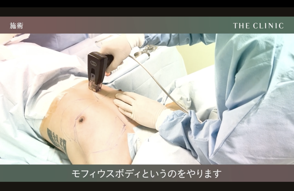 ②皮膚の引き締め:胸の下側のたるみを解消するため、熱を加えて皮膚の収縮を促す「モフィウスボディ」という施術を実施しました。